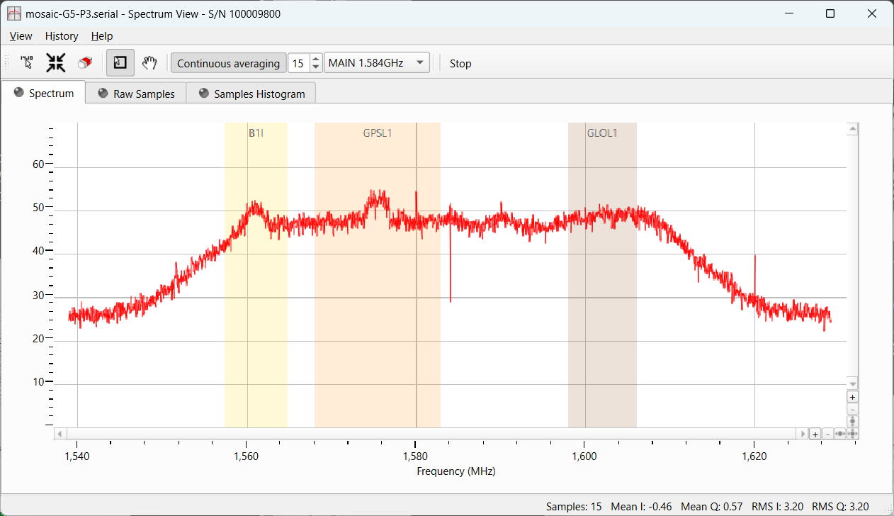 RxControlにはスペアナも付いているのでちょっと見てみる。RFフロントエンドは中心周波数 1.584, 1.2525, 1.188 GHzの3CHで、サンプリングは約90 MHz、4bit I/Qみたい。
