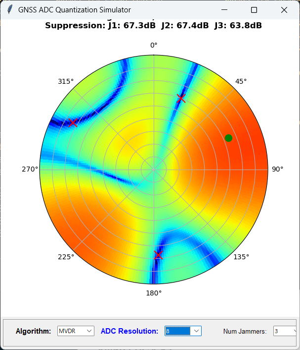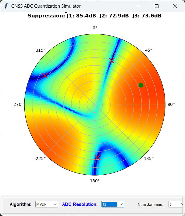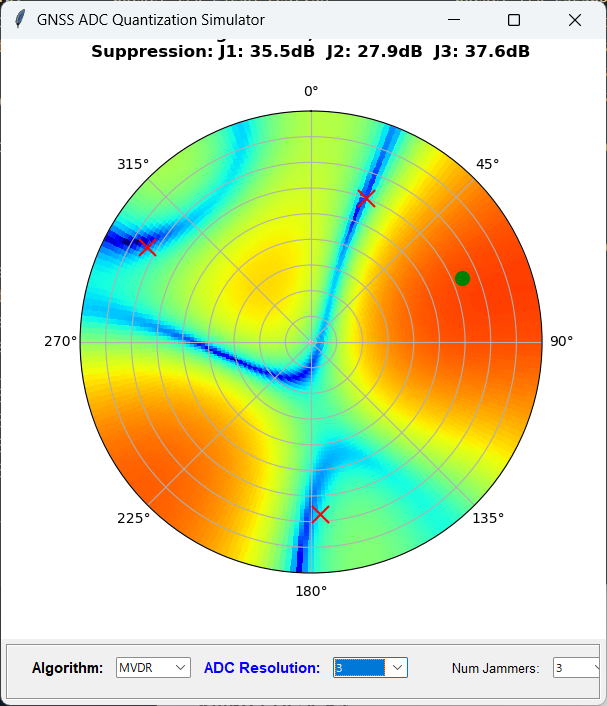 MVDR (mininum variance distortionless response) 法によるビームフォーマのアンチジャミング性能に対するADCビット数の影響。1/2波長間隔7素子平面アレイ。左からADCビット数3bit, 8bit, 12bit。図中ジャマーは赤×で3個、ビーム方向は右の緑〇。シミュレーションコードは、Geminiに指示して書いてもらったもので、1行も直していない。これ見ると3bitでも28-38 dBのsuppressionは得られるようだが12bitとは差が大きい。