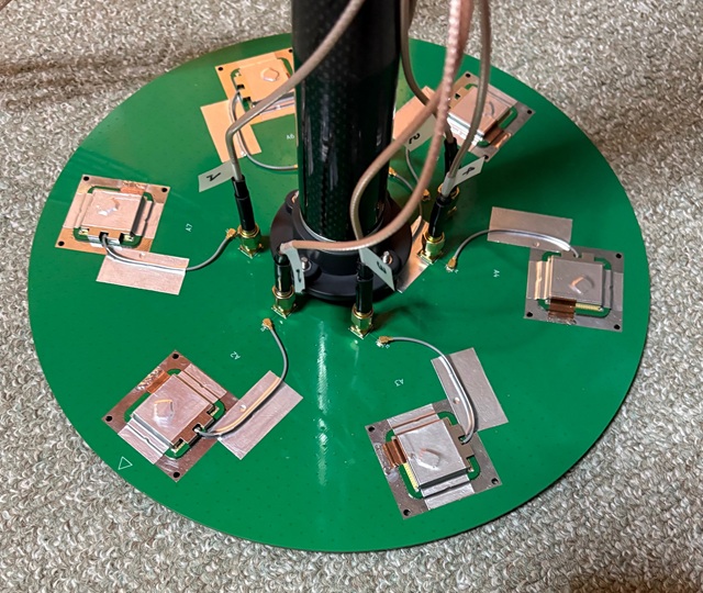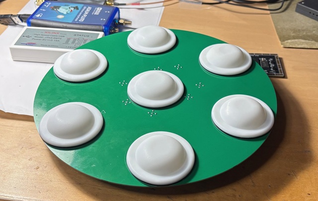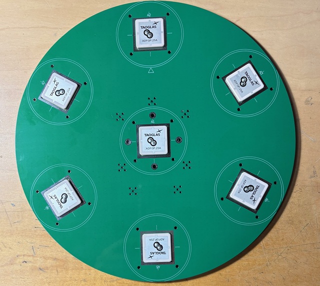 アンテナアレイの作り直し。25cm径で、(Taogras (参照) + u.FL→SMA変換アタプタ) x 7。今後3Dプリントのカバーをかぶせて白色塗装する予定。JLCPCBの基板最小注文数が5枚なので使わない余りが4枚。普通の1.6mm厚FR4両面基板です。希望される方がいれば、連絡いただければ差し上げます (CADデータはそのうち公開予定)。