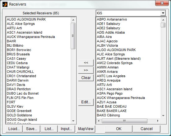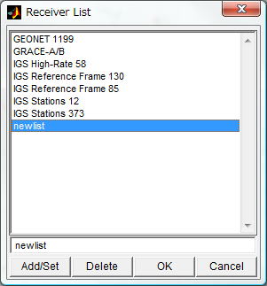 | Load... | Load the receiver list from a file. Specify the input file path by the file selection dialog shown when the button pushed. The file should be a text file which contains receiver names or a processing parameter file (prm_*.mat). |
