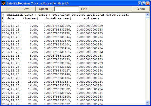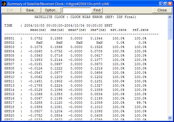 | Summary... | 基準衛星/受信機時計と比較した衛星/受信機時計バイアスの誤差サマリを出力します。 | |